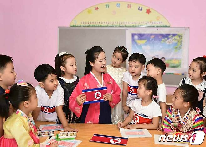 (평양 노동신문=뉴스1) = 북한 노동당 기관지 노동신문은 22일 "서성구역 와산유치원 어린이들의 마음속에 애국의 싹이 움터나고 있다"라고 전했다. 사진은 인공기에 대한 설명을 듣고 있는 북한 유치원 어린이들.