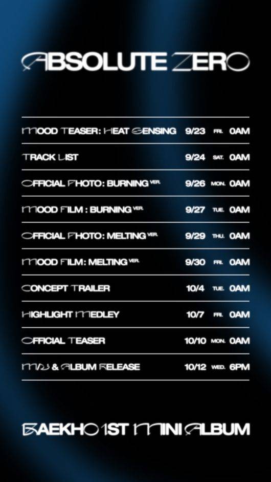 백호는 22일 0시에 공식 SNS를 통해 내달 12일 발매를 앞두고 있는 첫 번째 미니 앨범 ‘Absolute Zero’의 프로모션 스케줄러를 공개하며 본격적인 컴백 예열에 나섰다.