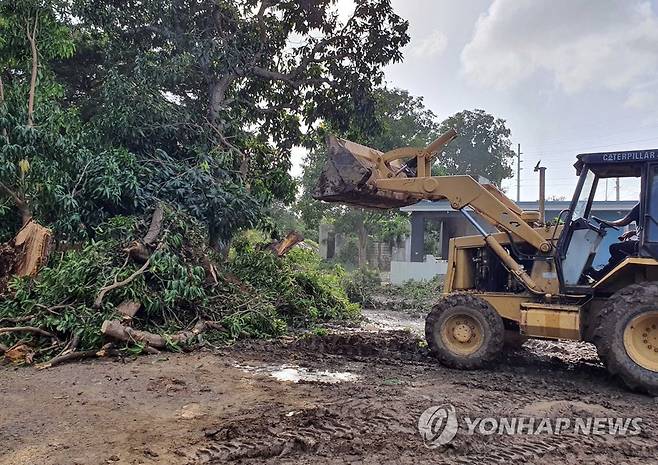 (살리나스=연합뉴스) 21일(현지시간) 푸에르토리코 남부 살리나스에서 주민이 중장비를 동원해 허리케인 '피오나' 강풍에 쓰러진 나무를 치우고 있다. 2022.9.22