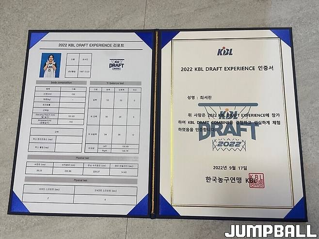 3시간에 걸친 측정이 모두 끝나고 ‘2022 KBL DRAFT EXPERIENCE’ 인증서와 리포트를 받았다. KBL에서 자신의 결과를 비교할 수 있게 초등학생, 중학생, 고등학생, 드래프트 참가자의 평균을 공개했다. 필자의 신장과 윙스팬은 초등학생 평균과 같았지만, 3/4 코트 스프린트에서는 4초로 초등학생 평균 4.41초를 뛰어넘었다. 전반적으로 아쉬운 결과였지만 초등학생 평균을 넘은 종목이 있다는 사실을 위안으로 삼았다.