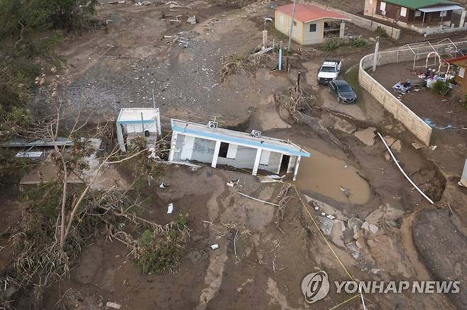 (살리나스 AP=연합뉴스) 21일(현지시간) 카리브해 푸에르토리코 남부 살리나스의 비야 에스페란사에 있는 주택이 허리케인 '피오나'로 인해 토사에 잠겨있다. 지난 19일부터 푸에르토리코 일대를 강타한 피오나는 현재 미국 동부 해안을 따라 북상하고 있다. 2022.9.22