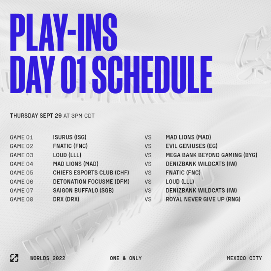 '리그 오브 레전드(LoL)' e스포츠의 한국 프로 리그를 주최하는 리그 오브 레전드 챔피언스 코리아(대표 오상헌, 이하 'LCK')는 오는 29일부터 10월 4일까지 멕시코의 멕시코시티 아르트스 페드레갈(Artz Pedregal)의 아레나 e스포츠 경기장(Arena Esports Stadium)에서 열리는 플레이-인 스테이지를 시작으로, 2022 LoL 월드 챔피언십(롤드컵)이 막을 올린다고 밝혔다.