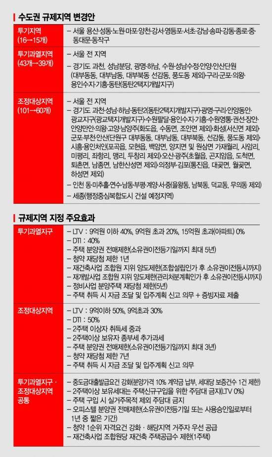 ◇새 정부 들어 가시적인 규제완화 조치= 전국적인 집값 하락세가 이어지고 있는 가운데 정부는 세종시를 제외한 전 지방 전역에 대한 ‘조정대상지역’을 해제하기로 했다. 수도권에서는 하락세가 가파른 인천의 투기과열지구를 해제하되 조정대상지역은 유지한다. 아울러 동두천·양주·파주·평택·안성 등 5곳은 조정대상지역에서 해제된다. 서울은 현행 규제지역이 그대로 유지된다.