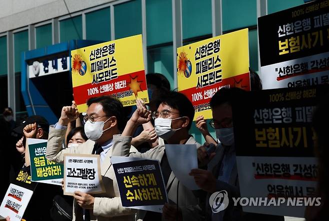 (서울=연합뉴스) 홍해인 기자 = 금융정의연대와 전국사모펀드 사기피해 공동대책위, 신한 피델리스펀드 투자자들이 22일 오전 종로구 서울경찰청 앞에서 신한은행의 피델리스펀드 사기 판매를 주장하며 고소·고발 기자회견을 열고 있다. 2022.9.22