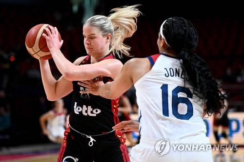 epa10198236 Becky Massey (L) of Belgium competes for possession with Brionna Jones (R) of the USA during the 2022 FIBA Women's Basketball World Cup game between the USA and Belgium at Qudos Bank Arena in Sydney, Australia, 22 September 2022. EPA/DAN HIMBRECHTS AUSTRALIA AND NEW ZEALAND OUT