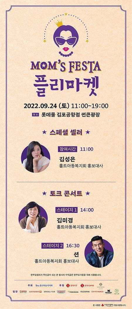 현장에서는 홀트아동복지회 김성은 홍보대사가 한부모 셀러를 응원하기 위해 스페셜 셀러로 참여할 예정이다. 또 ▲김미경 홍보대사의 ‘자존감 있는 엄마로 사는 법’ ▲션 홍보대사의 ‘지금은 선물이다’ 토크콘서트가 이어진다. 이 외에 롯데캐논, 스탠리, 와프랩이 팝업스토어로 함께 참여하며, 다양한 경품 추첨 이벤트도 마련된다.