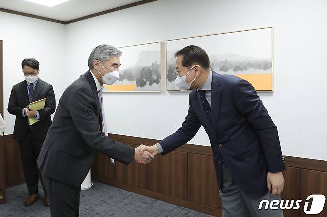 (서울=뉴스1) = 권영세 통일부 장관이 22일 오전 서울 종로구 정부서울청사에서 성김 미국 국무부 대북특별대표와 악수하고 있다. (통일부 제공) 2022.9.22/뉴스1
