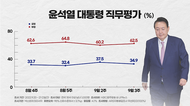 KBC광주방송과 UPI뉴스가 여론조사전문기관 넥스트위크리서치에 의뢰해 지난 20~21일 이틀 동안 9월 3주 차 정기조사를 실시한 결과, 윤 대통령이 '잘한다'는 응답은 34.9%로 지난주(37.5%)보다 2.6%p 감소했습니다.