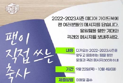 [마이데일리 = 김진성 기자] WKBL은 다가오는 2022~2023시즌을 앞두고 미디어 가이드북에 실릴 ‘팬이 직접 쓰는 가이드북 축사’ 참여 이벤트를 실시한다.