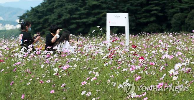 (원주=연합뉴스) 이재현 기자 = '2022 원주 용수골 가을꽃 축제'를 앞둔 22일 시민들이 코스모스가 만발한 원주시 판부면 서곡리 일원의 축제장에 찾아와 가을을 만끽하고 있다. 용수골 가을꽃 축제는 오는 23일부터 10월 3일까지 11일간 이어진다. 2022.9.22