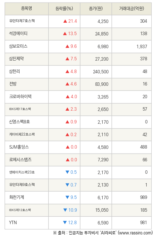 특히 유안타제7호스팩은 전 거래일 대비 21.4% 오른 4,250원에 거래를 마감하여 높은 관심을 받았다.