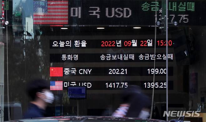 [서울=뉴시스] 추상철 기자 = 원달러 환율이 13년 6개월만에 1400원을 돌파한 22일 오후 서울의 한 외국계 은행 전광판에 환율이 나타나고 있다. 2022.09.22. scchoo@newsis.com