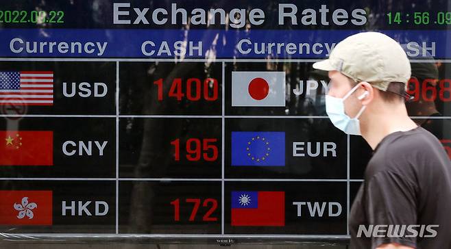 [서울=뉴시스] 추상철 기자 = 원달러 환율이 13년 6개월만에 1400원을 돌파한 22일 오후 서울의 한 사설환전소 전광판에 USD 1400원이 표시돼 있다. 2022.09.22. scchoo@newsis.com