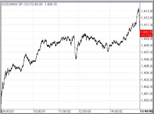 환율이 그나마 1410원 아래서 마감한 것은 외환당국의 개입으로 추정되는 스무딩 오퍼레이션(미세조정) 덕이다. 외환시장 관계자는 “점심께와 장 마감 직전당국 개입으로 추정되는 달러 매도 물량이 나오며 그나마 종가는 1409원선에서 마감하긴 했지만 이미 장중 고가 기준으로 1410원대를 뚫고 오른 만큼 향후 추가 상승이 불가피해 보인다”고 말했다.