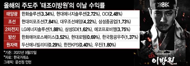 반면 '태조이방원'은 상승 마감했다. 태양광(한화솔루션(3.34%), OCI(2.48%), ), 조선(현대중공업(3.34%), 현대미포조선(7.84%)), 2차전지(LG에너지솔루션(1.88%), 삼성SDI(1.62%)), 방산(한화에어로스페이스(3.52%), 한국항공우주(5.17%)), 원자력(두산에너빌리티(0.29%), 한전KPS(0.4%)) 등이다.