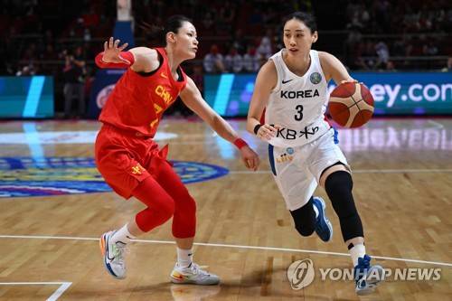 epa10198512 Leeseul Kang of Korea (R) drives to the basket during the 2022 FIBA Women's Basketball World Cup game between Korea and China at Qudos Bank Arena in Sydney, Australia, 22 September 2022. EPA/JAMES GOURLEY AUSTRALIA AND NEW ZEALAND OUT