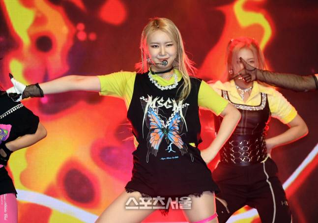 라필루스(Lapillus)의 베시가 22일 서울 광진구 건국대학교 새천년관에서 진행된 첫 번째 미니 앨범 ‘걸스 라운드 파트1(GIRL’s ROUND Part.1)‘ 발매 기념 쇼케이스에서 열정적인 무대를 선보이고 있다.