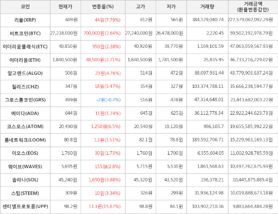 또한, 리플(7.79%, 609원), 코스모스(6.5%, 20,490원), 칠리즈(5.47%, 347원), 알고랜드(4.76%, 506원), 솔라나(3.88%, 45,240원), 스팀(3.34%, 309원), 웨이브(2.8%, 5,695원), 이더리움(2.71%, 1,840,500원), 이더리움클래식(2.38%, 40,850원), 에이다(1.74%, 644원), 이오스(1.73%, 1,760원), 룸네트워크(1.51%, 80.8원)가 상승세를 나타냈다.