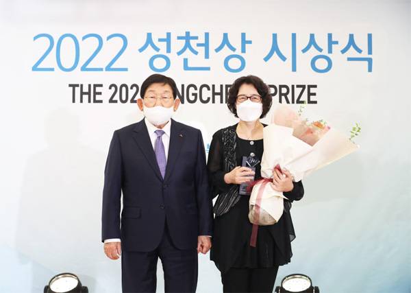 JW그룹의 공익재단인 중외학술복지재단이 지난 21일 JW그룹 본사에서 제10회 성천상 시상식을 개최했다. 이종호 중외학술복지재단 이사장(JW그룹 명예회장·왼쪽)과 수상자인 최영아 서울시립서북병원 진료협력센터장이 기념촬영을 하고 있다. '노숙인의 슈바이처'로 불리는 최 센터장은 노숙인 무료 진료 등 의료봉사를 지속하며 인류 복지 증진에 공헌한 점을 인정받았다. 시상식 이후에는 역대 성천상 수상자들이 한데 모여 10주년을 축하했다.