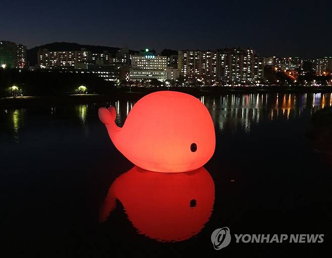 (울산=연합뉴스) 고래문화재단은 지난 21일부터 울산고래축제가 끝나는 10월 16일까지 울산 태화강 십리대밭교 아래 수면 위에 상괭이 모양의 대형 공기막 조형물인 '러브웨일'(LOVE WHALE)을 띄운다고 22일 밝혔다. 태화강에 전시된 러브웨일 모습. 2022.9.22 [울산시 남구 제공. 재판매 및 DB 금지]