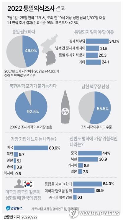 (서울=연합뉴스) 반종빈 기자 = 서울대 통일평화연구원이 22일 공개한 '2022 통일의식조사'에 따르면 북한의 핵 포기가 불가능하다는 응답을 한 비중은 92.5%로 2007년 관련 조사를 시작한 이래 가장 높았다.