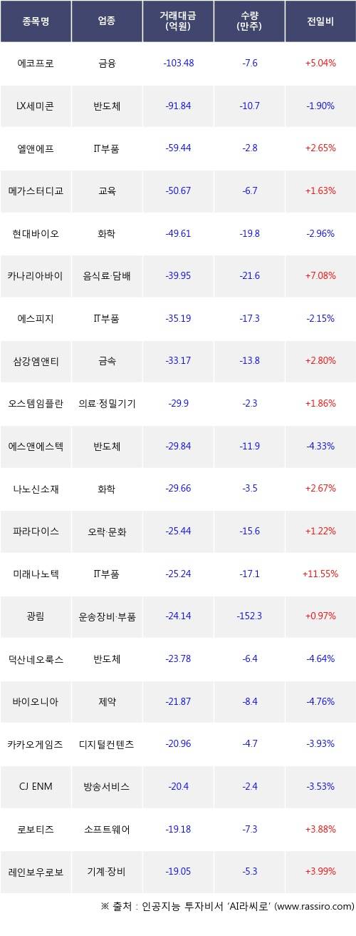 외국인 투자자의 순매도 상위 20개 종목은 에코프로, LX세미콘, 엘앤에프, 메가스터디교육, 현대바이오, 카나리아바이오, 에스피지, 삼강엠앤티, 오스템임플란트, 에스앤에스텍등이다.