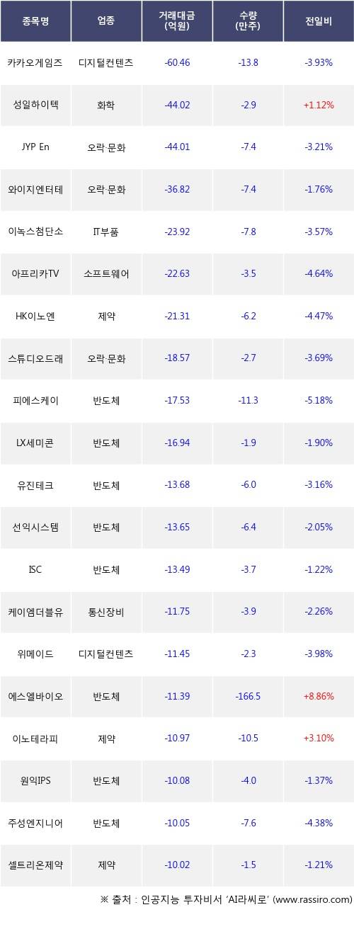 이날 기관 투자자가 순매도한 종목들 중에 성일하이텍, 에스엘바이오닉스, 이노테라피 등은 전일 대비 주가가 상승했고, 카카오게임즈, JYP Ent., 와이지엔터테인먼트 등은 주가가 하락했다.