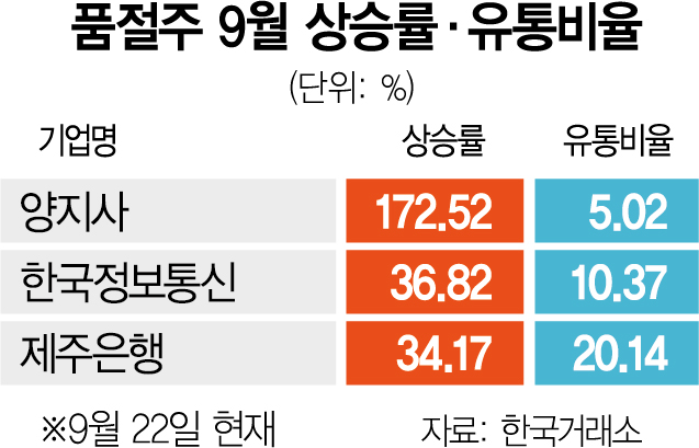 22일 한국거래소에 따르면 9월 들어 한국정보통신(025770)과 제주은행(006220)은 각각 36.82%, 34.17% 뛰어올랐다. 같은 기간 코스피지수가 3.43% 떨어진 것과 비교되는 수치다.