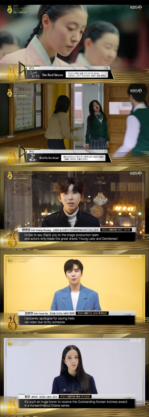 [OSEN=김채연 기자] ‘서울드라마어워즈’에서 김선호, 지수가 한류연기상을 수상했고, 한류 작품상은 ‘옷소매 붉은 끝동’과 ‘지금 우리학교는’에게로 돌아갔다.