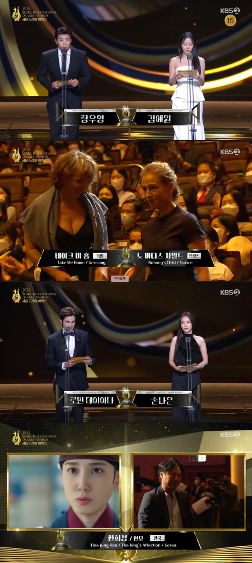 이어 연출상과 작가상 부문 시상을 맡은 손나은은 로빈에게 프랑스 내 한국드라마 인기를 물었다. 로빈은 “실제로 프랑스 친구들에게 K-드라마가 인기가 아주 많다. 나은 씨가 출연하는 드라마도 제 친구들에게 많이 홍보를 해보겠다”고 이야기했고, 연출상은 프랑스 ‘Nobody’s Child’의 아킴 이스커에게 돌아갔다. 작가상은 ‘연모’의 한희장 작가가 수상했다.