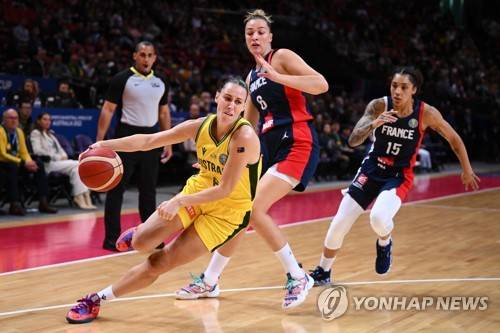 epa10198744 Steph Talbot of Australia (L) drives to the basket past Alexia Chartereau of France during the 2022 FIBA Women's Basketball World Cup game between Australia and France at Qudos Bank Arena in Sydney, Australia, 22 September 2022. EPA/JAMES GOURLEY AUSTRALIA AND NEW ZEALAND OUT