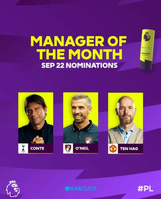 EPL은 22일(이하 한국시간) 공식 채널을 통해 9월 이달의 감독 후보 3인을 공개했다. 안토니오 콘테 토트넘 훗스퍼 감독, 개리 오닐 본머스 감독 대행, 에릭 텐 하흐 맨체스터 유나이티드 감독이 지명됐다.