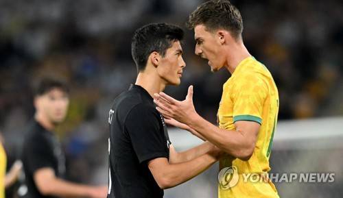 epa10198895 Elijah Just of New Zealand (L) reacts to Ajdin Hrustic of Australia during the International Men's Friendly match between the Australian Socceroos and the New Zealand All Whites at Suncorp Stadium in Brisbane, Australia, 22 September 2022. EPA/DAVE HUNT EDITORIAL USE ONLY AUSTRALIA AND NEW ZEALAND OUT