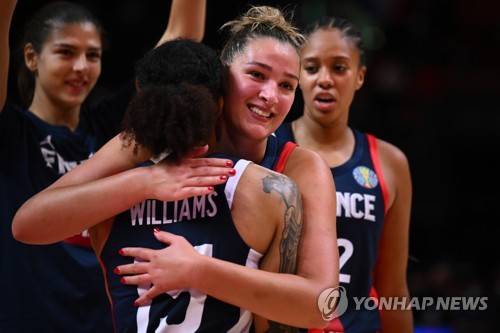 epa10199082 Alexia Chartereau of France hugs teammate Gabby Williams after defeating Australia in the 2022 FIBA Women's Basketball World Cup game between Australia and France at Qudos Bank Arena in Sydney, Australia, 22 September 2022. EPA/JAMES GOURLEY AUSTRALIA AND NEW ZEALAND OUT