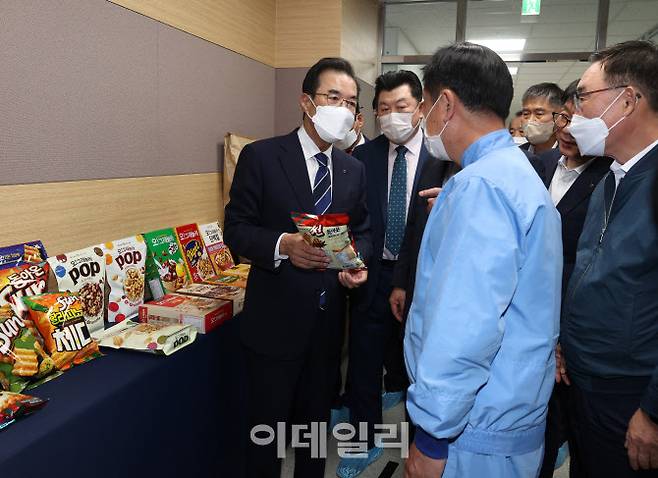 [이데일리 김태형 기자] 이성희(왼쪽) 농협중앙회장이 22일 경남 밀양시 오리온농협 본사에서 열린 쌀 가공산업 활성화 간담회 참석해 주요 쌀 가공품을 살펴보고 있다.