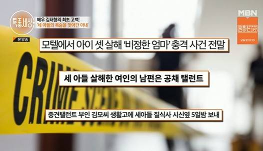 22일 방송된 MBN ‘특종세상’에선 중견 배우 김태형의 근황이 공개됐다. 2012년 보도된, 엄마가 모텔에서 어린 세 아들을 살해한 충격적인 사건이 보도됐다. 당시 피해자인 아이들의 아빠이자 피의자의 남편이 중견 배우 김태형이었다는 사실은 더욱 놀라움을 안겼다.
