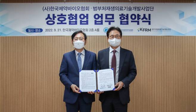 한국제약바이오협회(회장 원희목)는 범부처재생의료기술개발사업단(단장 조인호)과 재생의료 분야의 발전을 지원하기 위한 업무협약(MOU)을 21일 체결했다고 밝혔다.