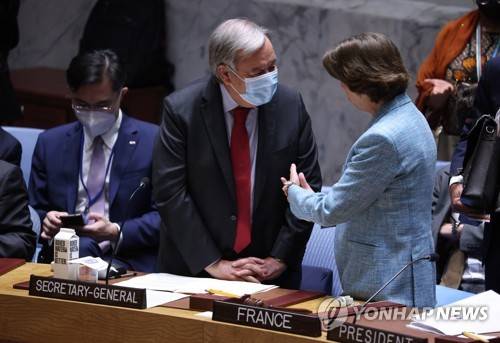 epa10199243 United Nations Secretary General Antonio Guterres (L) speaks with French Foreign Minister Catherine Colonna during a high-level United Nations Security Council meeting about the ongoing conflict in Ukraine on the sidelines of the General Debate of the UN General Assembly at UN Headquarters in New York, New York, USA, 22 September 2022. EPA/JUSTIN LANE
