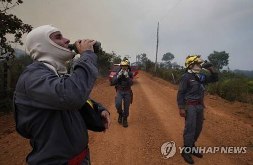 Fire brigade members drink water as they work to put out fires in Apui, Amazonas state, Brazil, Wednesday, Sept. 21, 2022. The Brazilian Amazon recorded more fires in the first week of September alone than in the whole of the same month last year, according to Brazil Institute for Space Research (INPE). (AP Photo/Edmar Barros)