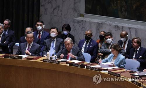 epa10199247 United Nations Secretary General Antonio Guterres (C) with Chinese Forreign Minister Wang Yi (L) and French Foreign Minister Catherina Colonna (R) during a high-level United Nations Security Council meeting about the ongoing conflict in Ukraine on the sidelines of the General Debate of the UN General Assembly at UN Headquarters in New York, New York, USA, 22 September 2022. EPA/JUSTIN LANE