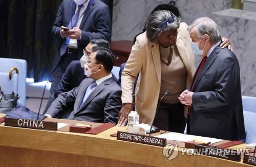 epa10199293 United Nations Secretary General Antonio Guterres (R) and US Ambassador to the UN Linda Thomas-Greenfield (2R) speak during a high-level United Nations Security Council meeting about the ongoing conflict in Ukraine on the sidelines of the General Debate of the UN General Assembly at UN Headquarters in New York, New York, USA, 22 September 2022. EPA/JUSTIN LANE