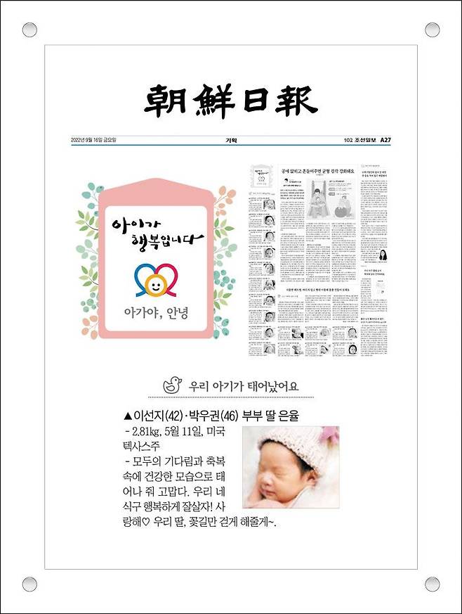 조선일보에 실린 우리 아기 출생 소식, 본인이나 지인의 인터뷰·사진 기사를 영원히 추억으로 간직하세요. 조선일보는 독자가 원하는 신문 지면을 그대로 고급 액자에 담아 드리는 ‘조선일보 리프린트’ 서비스를 시작했습니다. 매주 ‘아이가 행복입니다’ 지면에 소개된 한 가족을 추첨해 리프린트를 선물로 드립니다. 지난 16일 실린 이선지·박우권씨 부부 딸 은율이<사진>가 이번 주 주인공입니다. 자세한 내용은 홈페이지(reprint.chosun.com)에서 확인할 수 있습니다.