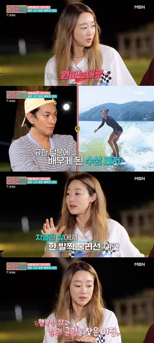 현재 가평에 방을 구해 살고 있는 최여진. 그는 "가평에 시즌 방을 얻어서 싱글 배드를 하나 놓고 살고 있다. 거기서 그냥 일어나면 날씨 좋으면 한 번 (수상레저)를 타고 피곤하면 낮잠 자고 먹고 싶으면 먹는다"며 "약간 도시 생활, 너무 열심히 살던 패턴에서 벗어나 있는 게 가끔 불안할 때도 있다. 그래서 오히려 일할 때 더 집중할 수 있는 것 같다"고 만족감을 표했다.