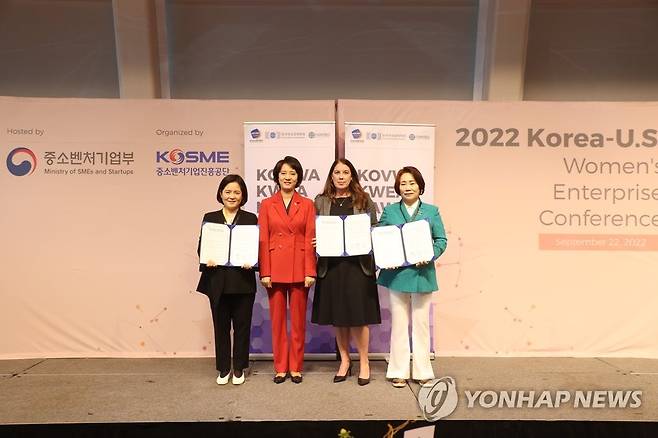 (서울=연합뉴스) 이영 중소벤처기업부 장관(왼쪽 두번째)이 22일(현지시간) 뉴욕대 킴멜센터에서 개최된 '한미 여성기업인 컨퍼런스'에 참석해 한미 3대 여성기업인단체인 한국여성벤처협회, 전미여성기업인협회, 한국여성경제인협회와 업무 협약 맺고 기념 촬영하고 있다. 2022.9.23 [중소벤처기업부 제공. 재판매 및 DB 금지]