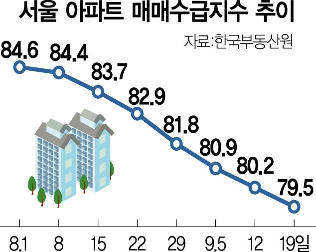 23일 한국부동산원에 따르면 이번 주 서울 아파트 매매수급지수는 전주(80.2) 대비 0.7포인트 하락한 79.5를 기록했다. 서울 매매수급지수가 70 선으로 떨어진 것은 78.7을 기록한 2019년 6월 넷째 주 이후 처음으로 3년 3개월 만이다. 이로써 서울 아파트 매매수급지수는 20주 연속 하락했다.