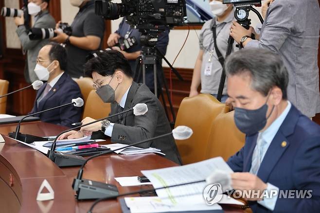 (서울=연합뉴스) 김승두 기자 = 추경호 부총리 겸 기재부 장관(왼쪽부터)과 한동훈 법무부 장관, 윤희근 경찰청장이 23일 정부서울청사에서 열린 국정현안관계장관회의에 참석해 있다. 2022.9.23