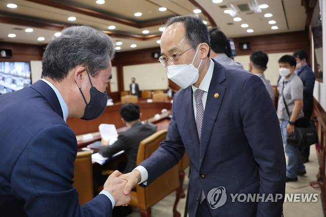 (서울=연합뉴스) 김승두 기자 = 추경호 부총리 겸 기재부 장관이 23일 정부서울청사에서 열린 국정현안관계장관회의에 참석하며 윤희근 경찰청장과 인사하고 있다. 2022.9.23
