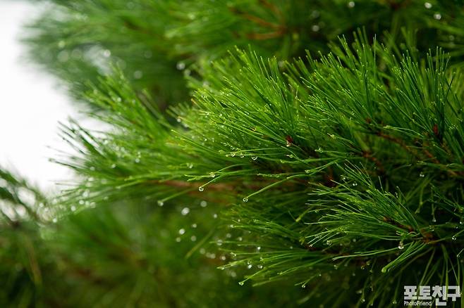 비 오던 날 솔나무 가지 사이에 빗방울이 맺혔다.