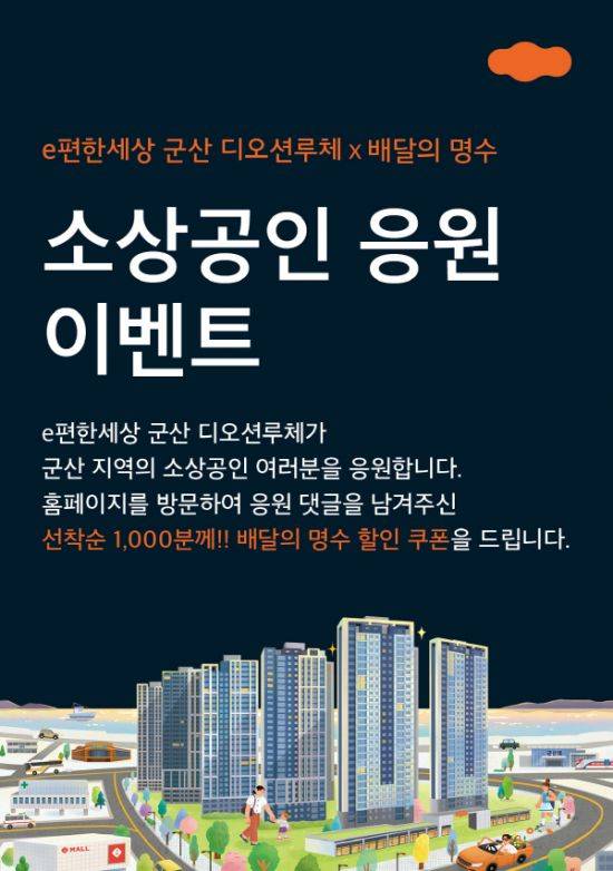 이는 군산시에서 운영하는 공공배달앱 '배달의 명수'와 협업해, 'e편한세상 군산 디오션루체' 홈페이지 내 군산 지역 소상공인에 대한 응원 댓글을 남기는 선착순 1,000명에게 '배달의 명수'에서 사용할 수 있는 할인 쿠폰이 제공되는 이벤트다.