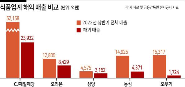 CJ제일제당은 지난해 상반기 전체 매출은 5조2158억원으로 이중 해외 매출은 약 45%(2조3932억원)을 차지했다. CJ제일제당 관계자는 “국내에서 환율로 인한 원가 상승 압박이 있지만 해외 사업으로 리스크를 어느 정도 완화할 수 있는 수준이다”고 말했다.